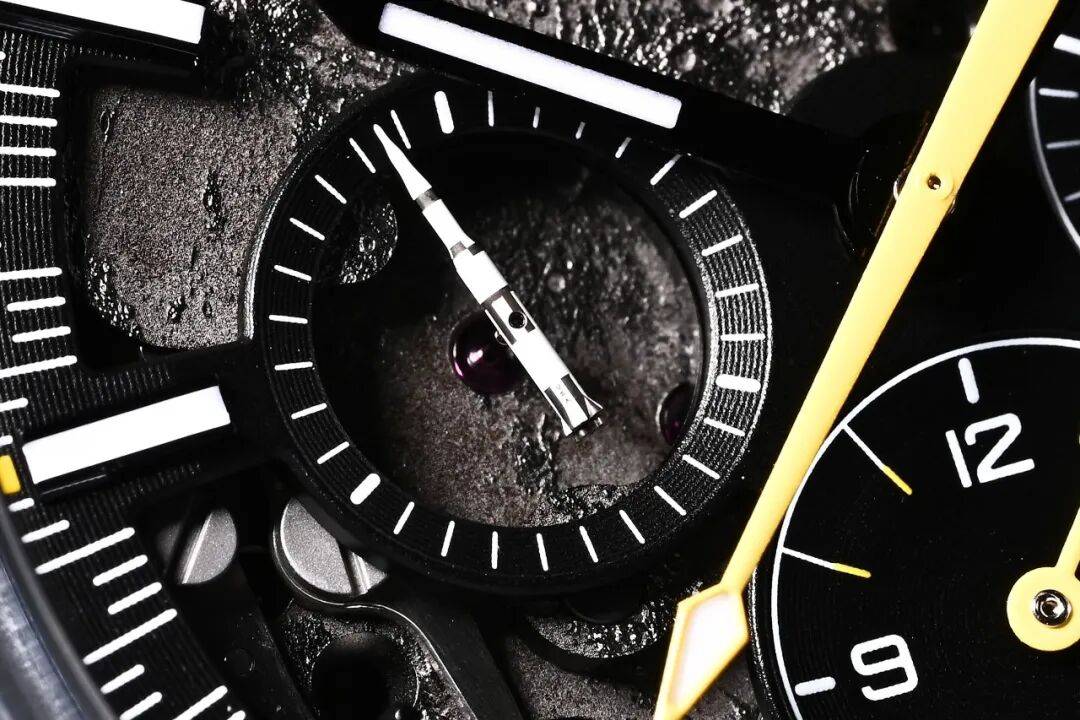 9点位的小秒针是这款腕表最引人瞩目的亮点,其造型是著名的土星5号运载火箭,由5级钛金属打造而成。这一3D立体造型由激光车削技术制成,并采用附着白漆、激光烧蚀和激光黑化工艺呈现出不同的色彩效果。这一精巧且令人惊叹的细节,旨在致敬阿波罗任务所取得的非凡成就。